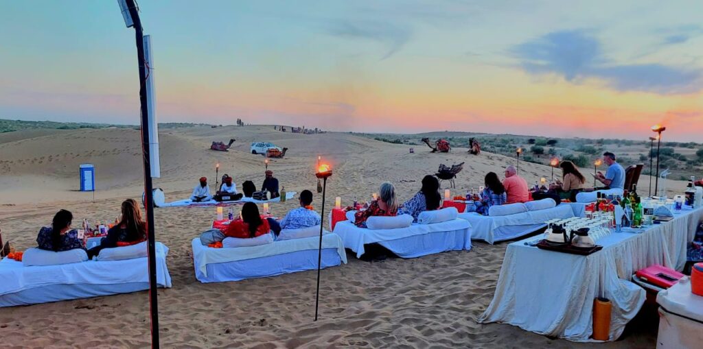 For a memory that will truly last a lifetime, indulge in the “Dinner on Dunes by Shrinath Adventures.” This exclusive experience is a private, curated dining affair set on a pristine, secluded sand dune, away from the bustling camps.